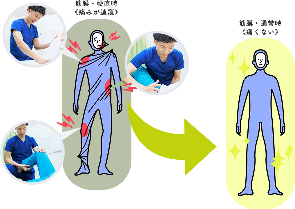 筋膜は全身を覆う一枚の膜で、まるでウェットスーツのように身体と一体になって伸び縮みします。ところが一部が硬くなると、その周囲も動きが制限され、さらに硬さが広がっていきます。硬い部分も動作に合わせて無理に伸ばされるため、コリだけでなく痛みの原因にもなります。肩が上がらない、腰が曲げられないといった症状は、この筋膜の硬さによって起こります。